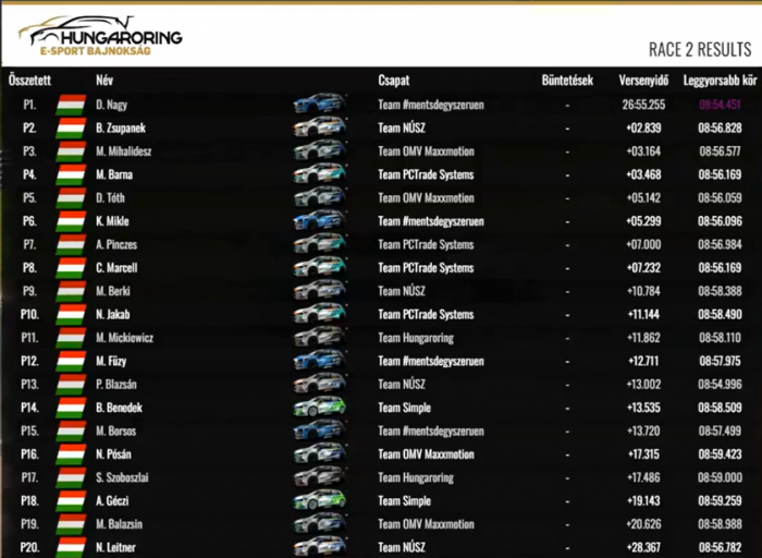 Nagy magabiztosan húzta be a győzelmet, amivel jelentően csökkentette hátrányát Báldival szemben. A bajnokságot még mindig a Team Simple pilótája vezeti 144 ponttal, de mögötte Nagy következik 126-tal, aztán Tóth Dávid 102-vel, Pinczés Ádám 95-tel, az ötödik helyen pedig holtversenyben Csuti Zoltán és Leitner Norbert áll 84-84 egységgel – utóbbiak is sajnálhatják, hogy a második futam vége rosszul alakult nekik. Javítani két hét múlva a virtuális szepangi pályán lehet a Hungaroring E-sport Bajnokság negyedik fordulójában.