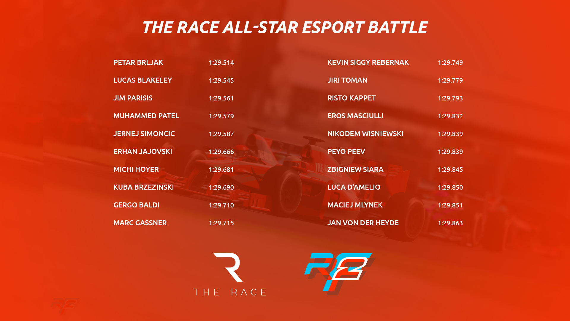 Összesen 60 versenyzővel kezdődik a The Race All Star Esports Battle névre keresztelt esemény, amelyet kifejezetten az elmaradt Forma-1-es hétvége alternatívájaként hoztak létre a szervezők. A rajtlistából jól látszik, hogy milyen komoly presztízse van a versenynek, hiszen 40 nemzetközi sztárpilóta kapott meghívást az exkluzív megméretésre. A neveket folyamatosan hozzák nyilvánosságra, de a már megerősített indulók között találjuk többek között a Red Bull F1-menőjét, Max Verstappent is (kicsit lejjebb mutatjuk a már bejelentett sztárindulókat).