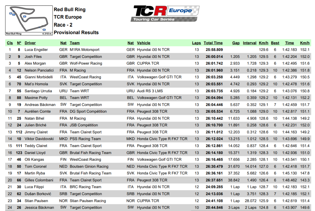 “Nagyon boldog vagyok, fantasztikus futam volt! Őrület volt a pályán, de ezek az izgalmak jók a bajnokságnak, és örülök a csapat miatt is, amely már régóta várt erre a győzelemre. Amikor Tom Coronel mögött voltam, óvatos maradtam, mert tudtam, hogy boxutca-áthajtásos büntetést kapott, emellett azonban nagyszerű csatákat vívtam többekkel is egy meglehetősen csúszós pályán. Az autónk jobb teljesítményre képes száraz körülmények között, úgyhogy nem volt egyszerű dolgunk. Sajnálom Filippit, aki kiesett az ütközésünk miatt, de én a saját vonalamon haladtam, ő jött belém” – értékelt a győztes Luca Engstler.