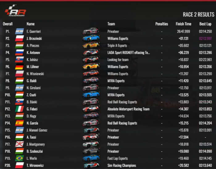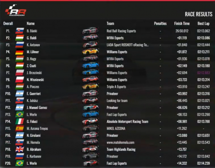 A hajrában Báldi mégis megpróbálkozott Löhner újbóli megelőzésével, nem sok kellett a sikerhez, de rosszul jött ki a helyzetből, és Nikodem Wisniweski előzte meg őt. A nyolcadik helyen zárta a futamot, de ez is elég volt a bajnoki cím megszerzéséhez. Báldi Gergő nyerte a WTCR Esports előszezonját!