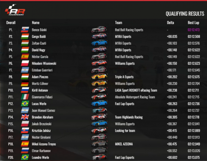 Stratégiai szempontból kulcsfontosságú volt, hogy Báldi mögött a M1RA Esports másik két versenyzője, Nagy Dávid és Csuti Zoltán szerezte meg a harmadik és a negyedik helyet az időmérőn, így ők betonvédelmet biztosíthattak számára. Ezt meg is tették az első futamon, ugyanis Löhner feljött mögéjük az ötödik helyre, de akárhogyan próbálkozott, nem tudta áthámozni magát az előtte utat záró M1RA-duón.